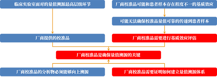 临床实验室所能到与量值溯源有关的事务如下:①校准品;②检测程序(仪器、试剂等),很显然处于量值溯源更高层级的为校准品,因此校准品是确保临床实验室定量检测结果具备量值溯源的关键。